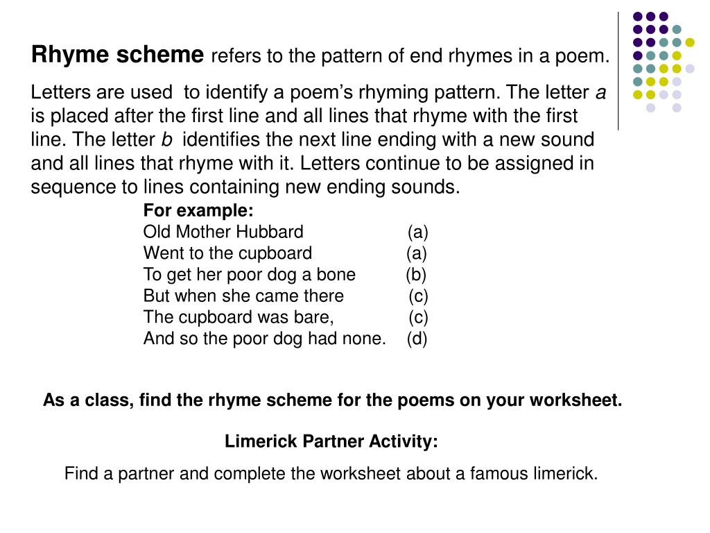 Even weak students can produce a good poem by followi. In this lesson, we will introduce rhyme scheme and practise identifying. Every time there is a new end sound in a stanza, . The rhyme scheme is given. Verify your understanding of rhyme schemes in poetry with an interactive practice quiz and study worksheet.